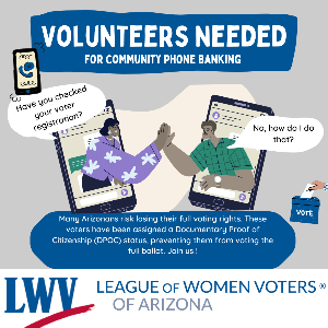 The League of Women Voters of Arizona has partnered with One Arizona to notify affected voters and assist them in checking their registration status prior to the next election. We need YOUR help through phone banking.